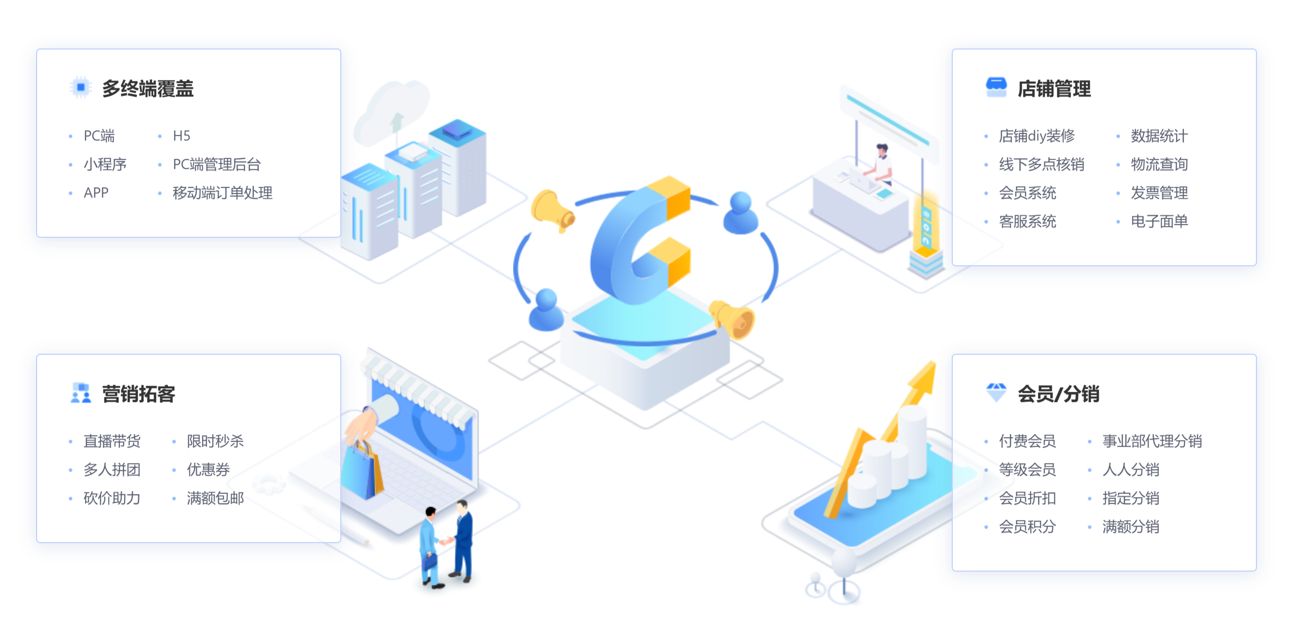 以社交电商为核心,搭配分销模式的分销体系,结合拼团、砍价、会员体系等热门社交电商玩法,助力企业突破传统获客瓶颈,实现线上销售业务的长效稳步发展。