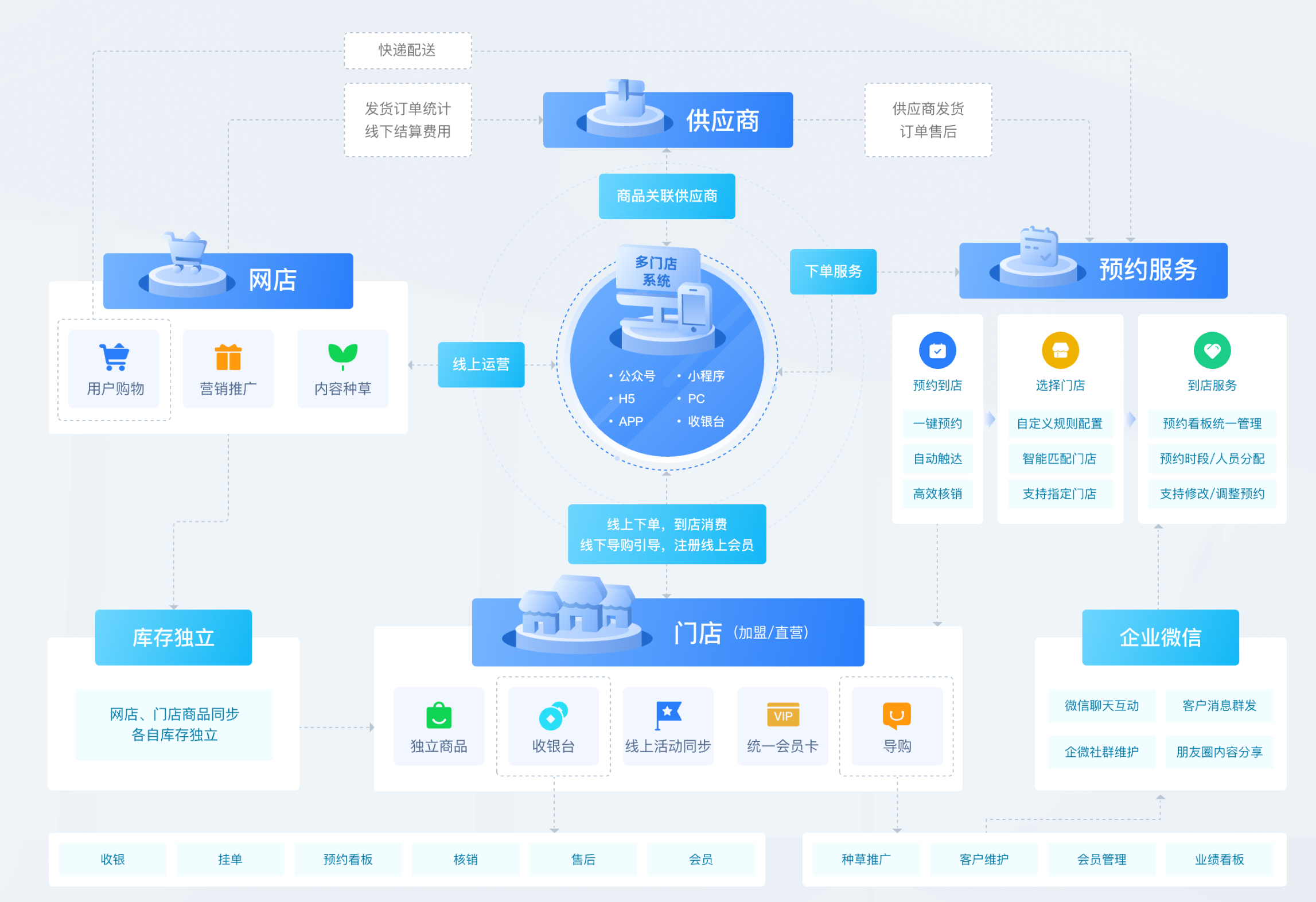 为品牌连锁、加盟企业提供线上线下一体化门店、收银、会员管理解决方案,强化连锁门店统一管控,实现业务高效运作,促进“线上电商”与“线下门店”销售运营融合,加速品牌连锁门店数字化转型。