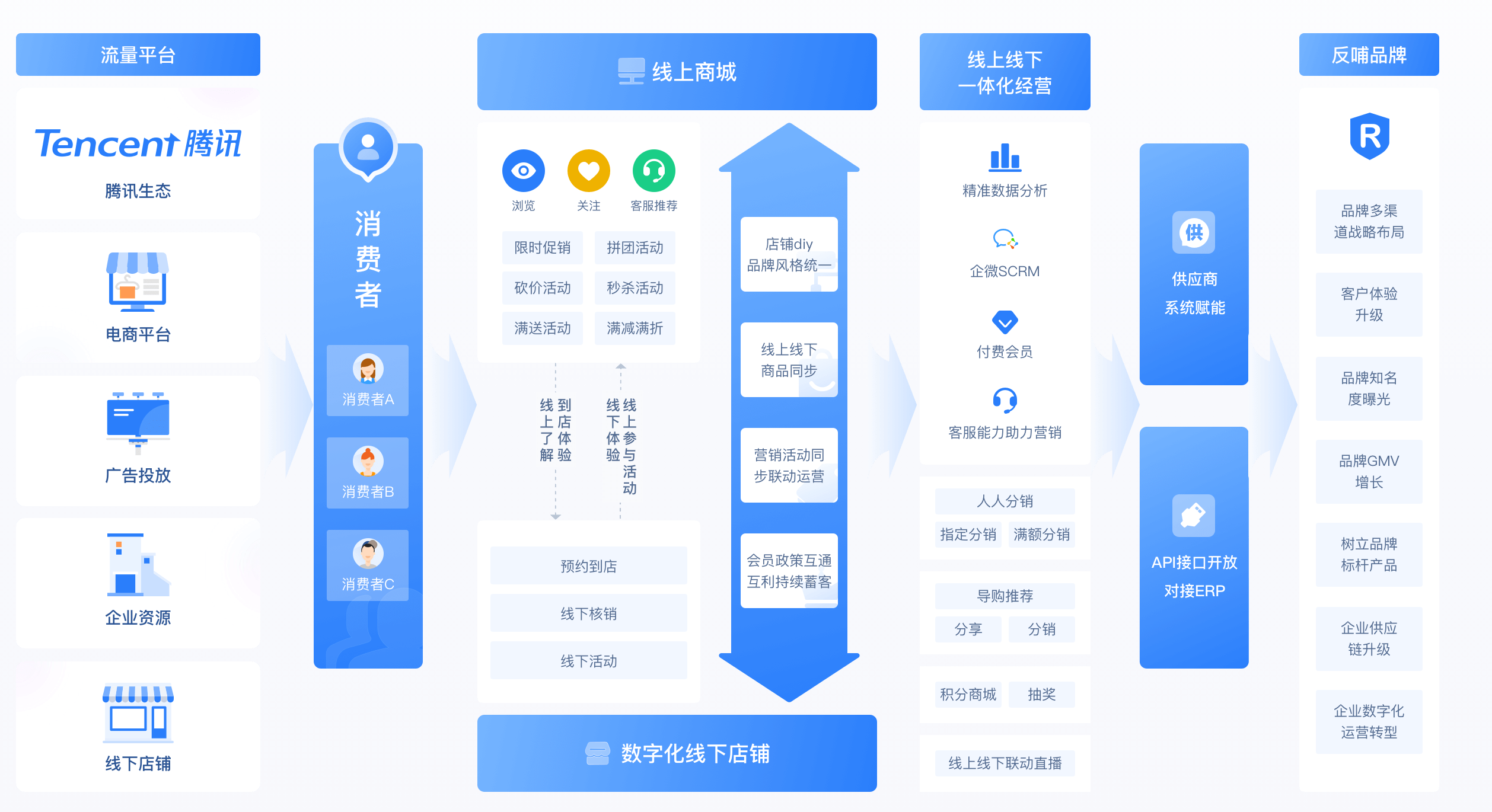 线上引流、到店消费;线下获客、线上转化;多种营销模式组合,打通线上线下营销壁垒,形成销售闭环,有效提升销售转化!
