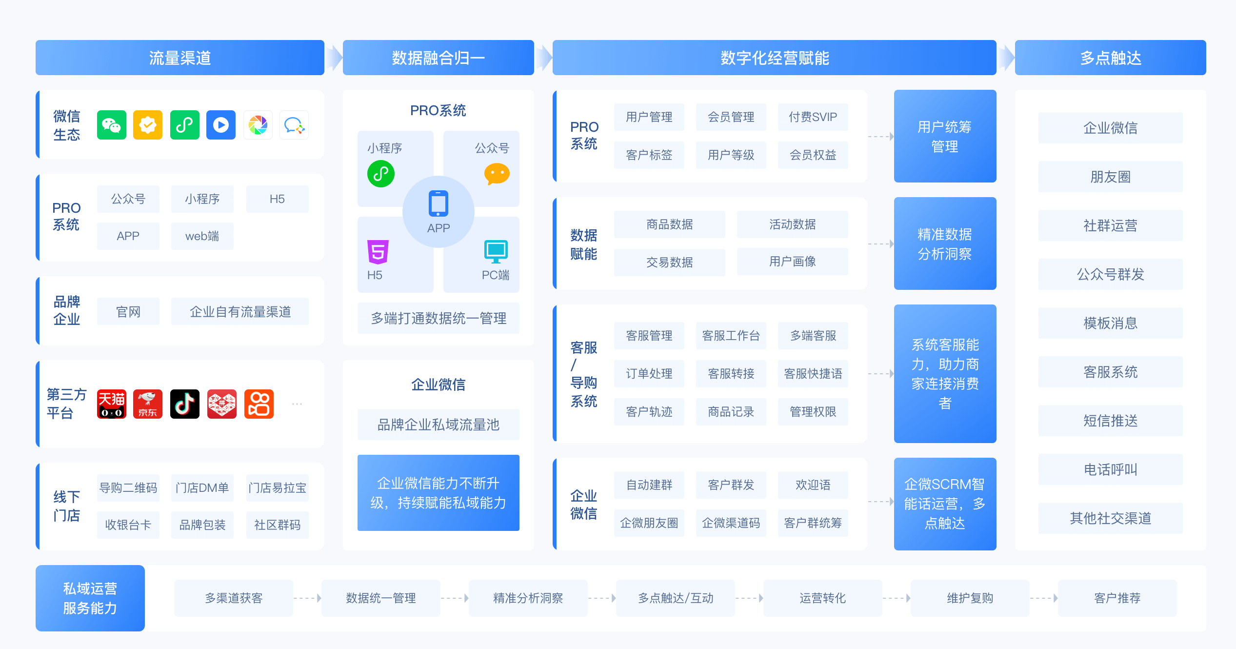 企业微信能力不断升级,集合店铺管理、社群管理、用户管理、客服等能力,帮助商户直连消费者,精细化运营私域流量。