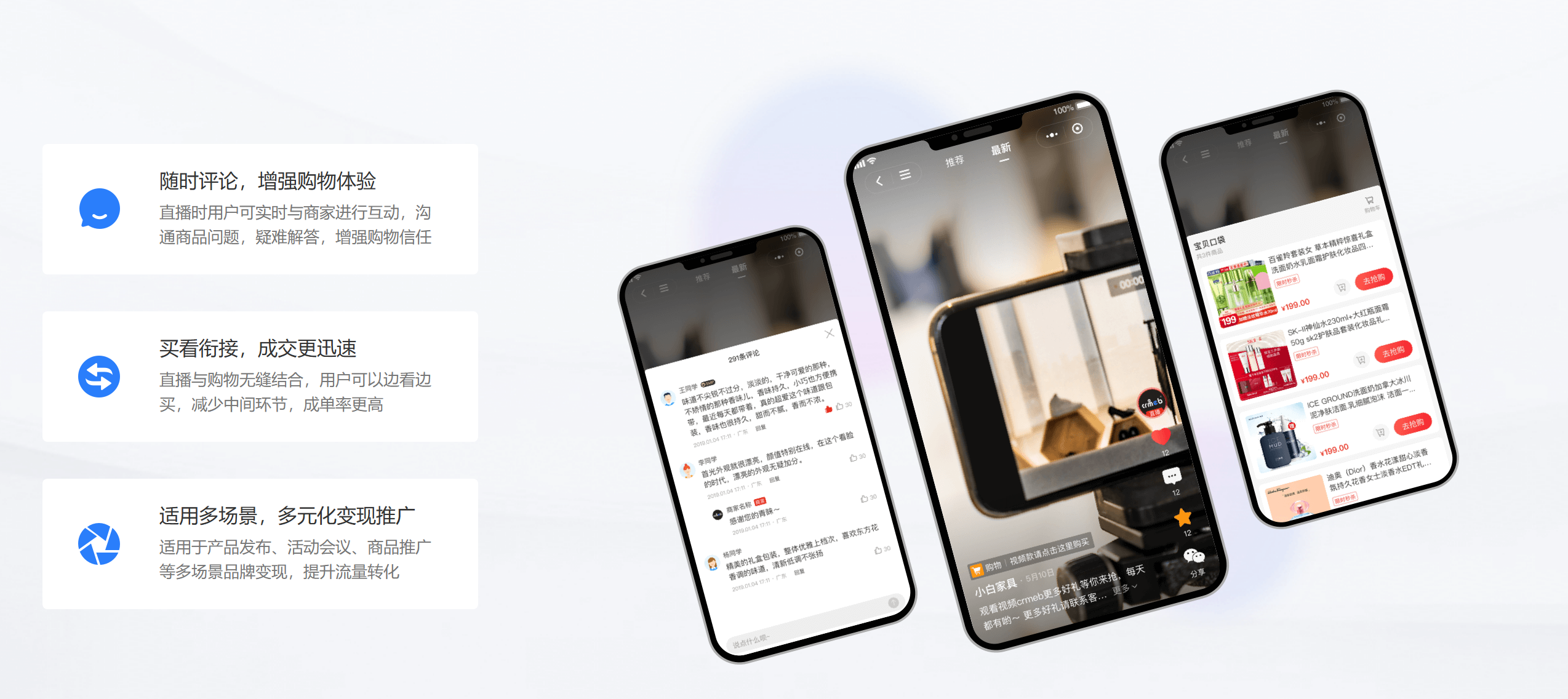 无缝对接微信小程序直播,依托微信12亿用户,抓住微信直播红利,让平台“流量”变“销量,商家还可以将视频介绍关联到直播间,让用户边看边买